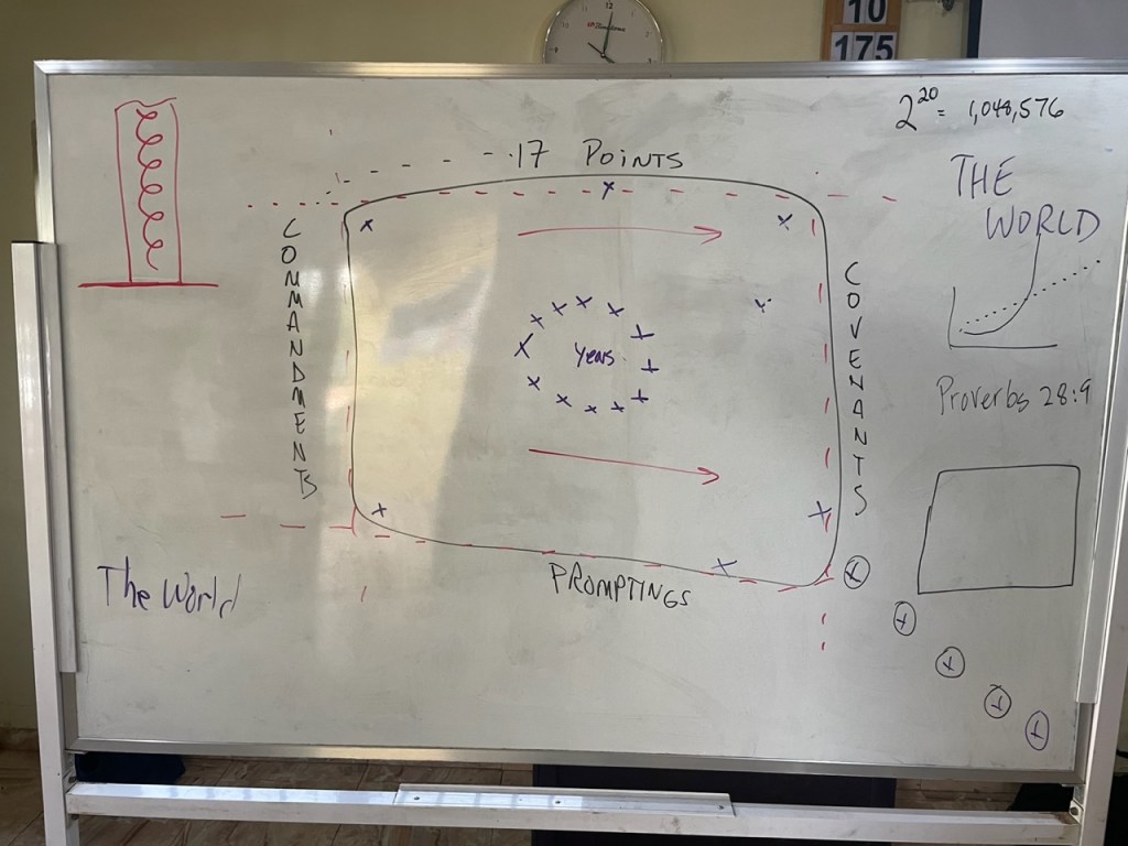 The other thing we discussed during the refresh came to be known simply as “The Box”. Below is one of the pictures I drew on the whiteboard (ignore the 2 to the 20th power in the upper right corner – that had to do with a “multiplicity of blessings”). The idea of the box came from a quote from President Nelson that LaDawn uses in our orientation of new missionaries. “Facing God first lets us decide firmly what we shall not do; then we are free to pursue what we ought to do.” This concept is powerful and it led me to think about how to depict this visually. For our missionaries, I draw the box with sides being the commandments, the 17 points of consecrated obedience (a close cousin to the commandments) our covenants, and the promptings we receive from the Spirit. When we live inside the lines of these four things, then we are free to pursue what we ought to do. In fact, inside the box there are no penalties for sin, because there is no sin inside the box. Let me clarify. While there are people inside the box who sin from time to time, it is primarily out of weakness and never rebellion. Those inside the box seek only to the live in the light, so daily repentance is a way of life. It is what keeps them inside the box. At one of the zone conferences as I was explaining the box, the story of Lachoneous and Giggidoni from 3 Nephi chapters 3 and 4 came to mind. The Gadianton robbers had been terrorizing the Nephites and now righteous Lamanites and promised to destroy them if they refused to join them. Lachoneous was the governor of the land, and to save his people from the impending attack, he gathered them into the center of the land, away from the borders, and there built fortifications and subsisted for a period of 7 years. Ultimately there were battles that resulted in deaths on both sides, but in the end the robbers were destroyed or cast into prison. It is a great story about the importance of “staying between the lines”. There is safety in the center of the box. Two other insights came as I taught this. For some, the box may seem small and restraining, however, as Elder Harnois pointed out, the box is infinite in size. While the world is just a flat plane and is limited in what it offers, the box extends infinitely up, making it infinitely bigger than the offerings of the world. I also came to understand that the box is constantly moving. If someone is born in the box and then becomes complacent, the box will move away from them. Think of the changes in the church over the last 5 years. It seems the speed at which the box is moving is increasing as we come ever closer to the return of our Savior. The small box down on the right, is for those who want to be a law unto themselves. They want to create their own box, without any restraints. They want to make the rules. Unfortunately, that is not a long term proposition that works due to the consequences of the choices one makes inside their own box. The last thing I will mention is that the closer a person who is in the box moves to the boundary lines, the more apt they are to be attacked by the adversary. The x’s in the right hand bottom corner depicts the person that just slowly gets led away from the box and when they finally decide they want to return, they discover the way back is not as easy as they thought it would be. Plus, the box has moved. Every discussion on the box went well and seemed to resonate with the missionaries. I learned something new each time we discussed it.