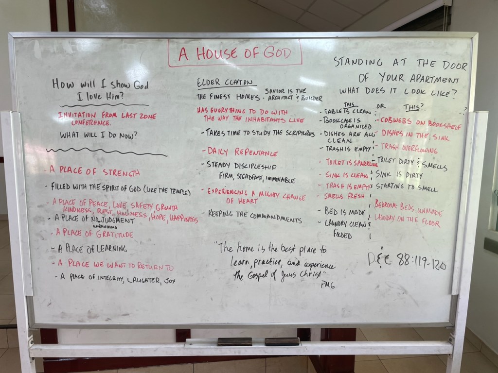 - Following the zone leaders, LaDawn talked about the importance of clean apartments where the Spirit of the Lord can dwell. She followed that with some quotes from Elder Clayton’s talk on “The Finest Homes”. A part of her instruction, she had the missionaries close their eyes and do a virtual walkthrough of their apartments. It was wonderfully done and the missionaries felt the difference between a clean apartment and a dirty one.