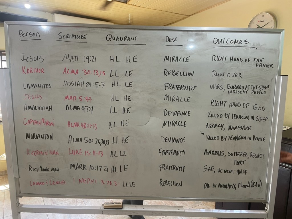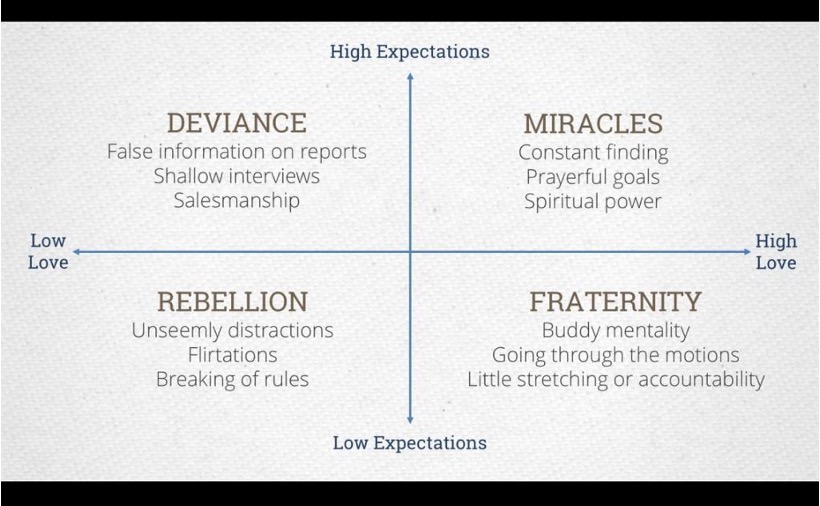 - Vision Refresh – This time I did a study of people in the scriptures (primarily Book of Mormon and New Testament) who can be classified into each of the four quadrants representing Love and Expectations. Here is what our finished whiteboard looked like. It was a great exercise to help the missionaries understand that we can actually assess where we are based on how we are currently living our lives. These quadrants really do represent scriptural people and perhaps of most importance, was the long-term outcomes. If we are not living our lives in the miracle quadrant, the long-term outcome is simply not very good.