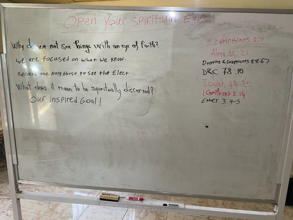 - The last discussion of the day was from me focused on receiving personal revelation. It was based on an instruction I gave in December of 2021, but now changed a bit. The reception of the doctrines was significantly more pronounced this time. The instruction was called, “Eyes to See” “Ears to Hear” “Hearts that Understand”. I shared with the missionaries that the more willing we are to place our wills on the altar, the greater the personal revelation we will receive. I also discussed the Light of Christ and how it is used by the Holy Ghost to deliver gifts and miracles to each of us. If you are interested, you can find the presentation here.
