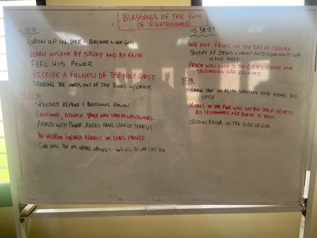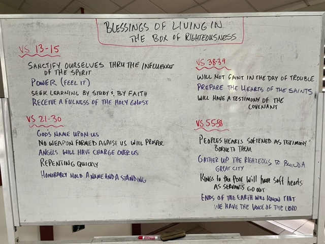 And here are the three boards from LaDawn’s instruction on the blessings of “living inside the box” of our covenants, commandments, mission rules, and spiritual promptings. LaDawn used Doctrine and Covenants 109 to identify the blessings that come to those who live righteous, temple worthy lives.