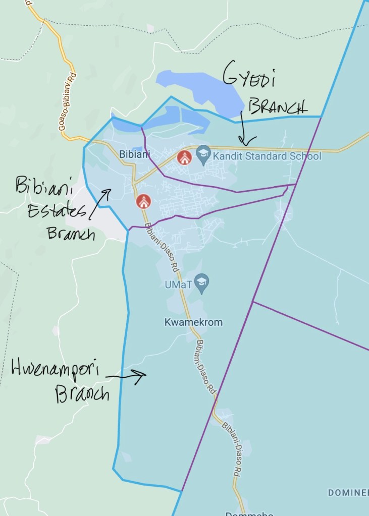 On Sunday, July 30th, we arose early and drove the two hours to Bibiani. We arrived just after 8:30 am. The occasion was the formation of the Hwenampori Branch. Explaining the pronunciation of this new unit is a bit difficult. It is a very light “shw” sound at the beginning represented by the Hw (Shwen-am-poor-ee). In any case, this branch was created out of the Bibiani Estates Branch and the former District Clerk was made the branch president. His name is Evans Appiah-Kubi. His first counselor is Seth K. Eduku and the clerk is Kwadwo D. Annor. All three are in their very early 30’s. Kwadwo is the only one who is married, but all have jobs and are stable financially. A good time to get married! I told them their first job is to get an Elders Quorum President and a Second Counselor in the Branch Presidency. This branch is already quite large in terms of membership so now they will need to go and reactivate some who have lost their way. Once we get the number of missionaries back up to 200, I hope to put a set of missionaries in the branch to help it grow. For now, Elder Panton and Elder Akwa (Bibiani Zone Leaders) will cover both units.