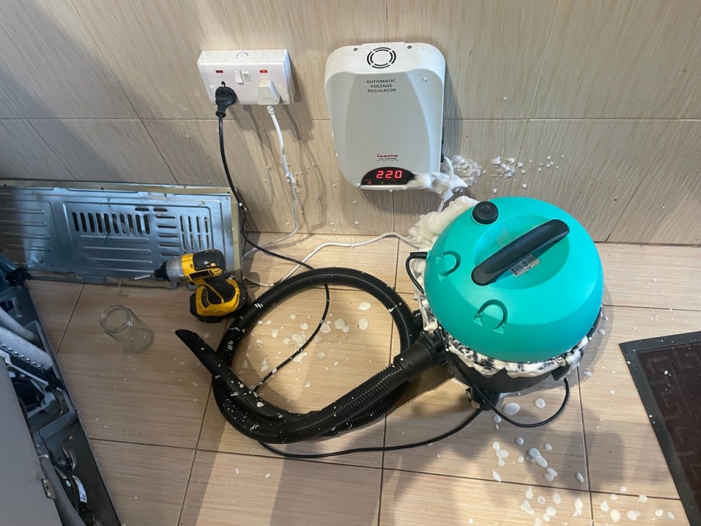 The other thing I will mention is the smell of dirty socks in the kitchen. It has been growing in intensity and we could not figure out where it was coming from. LaDawn insisted that it seemed to be coming from the refrigerator, but we checked for a drip pan and there wasn’t one. I finally unscrewed the plate on the bottom of the back and there we found the problem. There is some sort of drip pan there that is screwed in and cannot be removed. There was a brown crusty gunk in the bottom of the pan. Because the fan and lines to the compressor ran through the plastic “pan”, it was difficult to get to it. We decided to put some Dr. Bronner’s Sal Suds concentrate into a glass of water and then pour it in the pan with the hope of vacuuming it out with our semi wet/dry vac. I may have been a bit generous with the concentrate, for after letting it sit for over an hour, when I vacuumed it out, I was surprised by the suds machine I had created. It took some effort to get it all cleaned up but the good news is that the smell is gone!