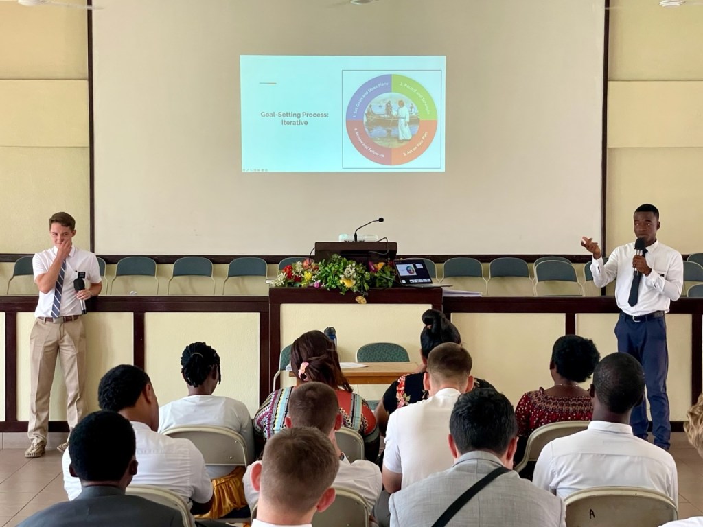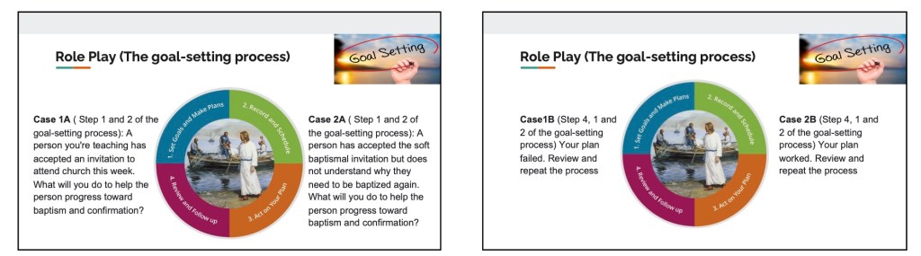 In each of the conferences as part of the Assistant’s instruction, we did a role play on how to use the goal setting process to set goals and achieve them. It was really well done. Here are the slides we used for the role plays and some pictures of the missionaries “learning by doing”.