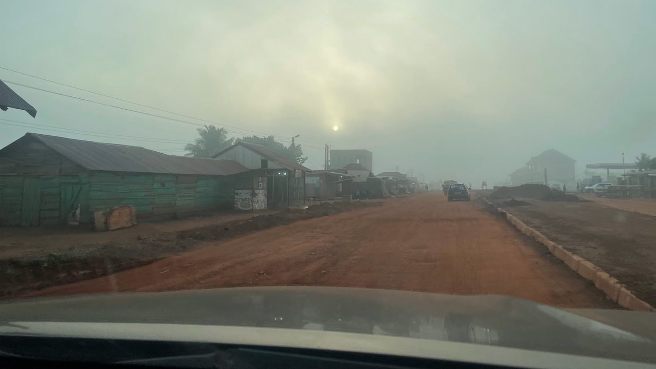 On Wednesday, November 29th we left Sunyani early in order to make it to Techiman for interviews which started at 8:00 am. It takes us between 1.5 and 2.0 hours to travel the 62 km (40 miles) between the two cities – mostly because the road is so poor. As we left out of Sunyani, LaDawn snapped a picture of the mixture of fog and dust and early morning sun hovering over the outskirts of the city.