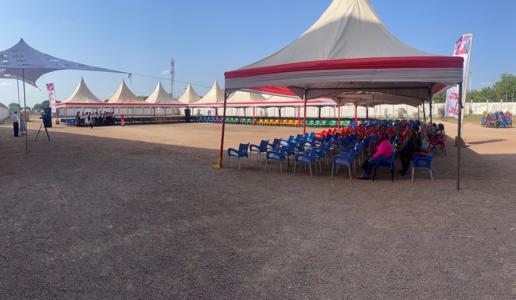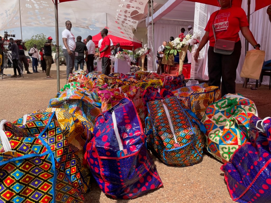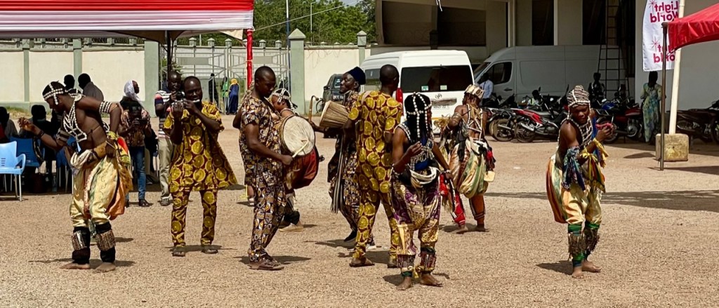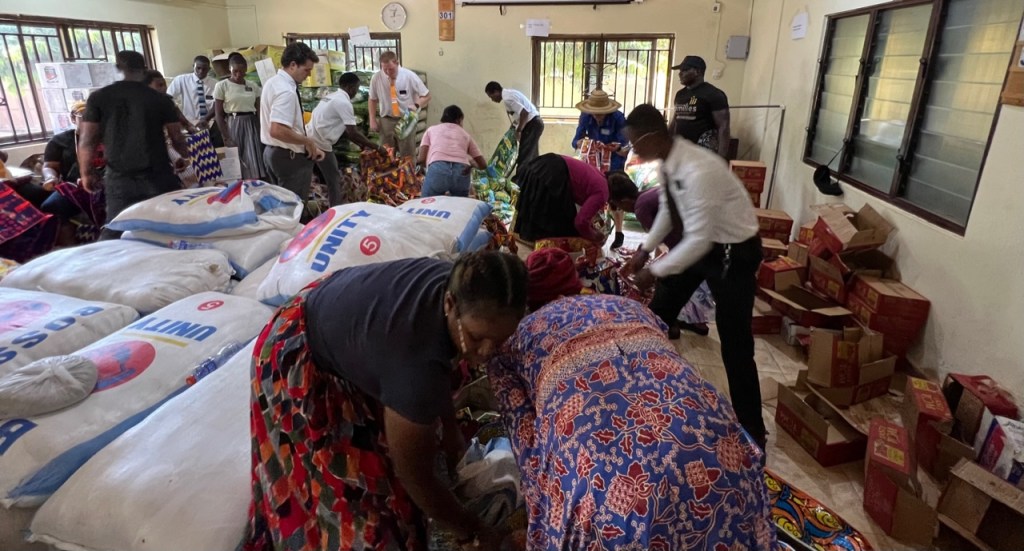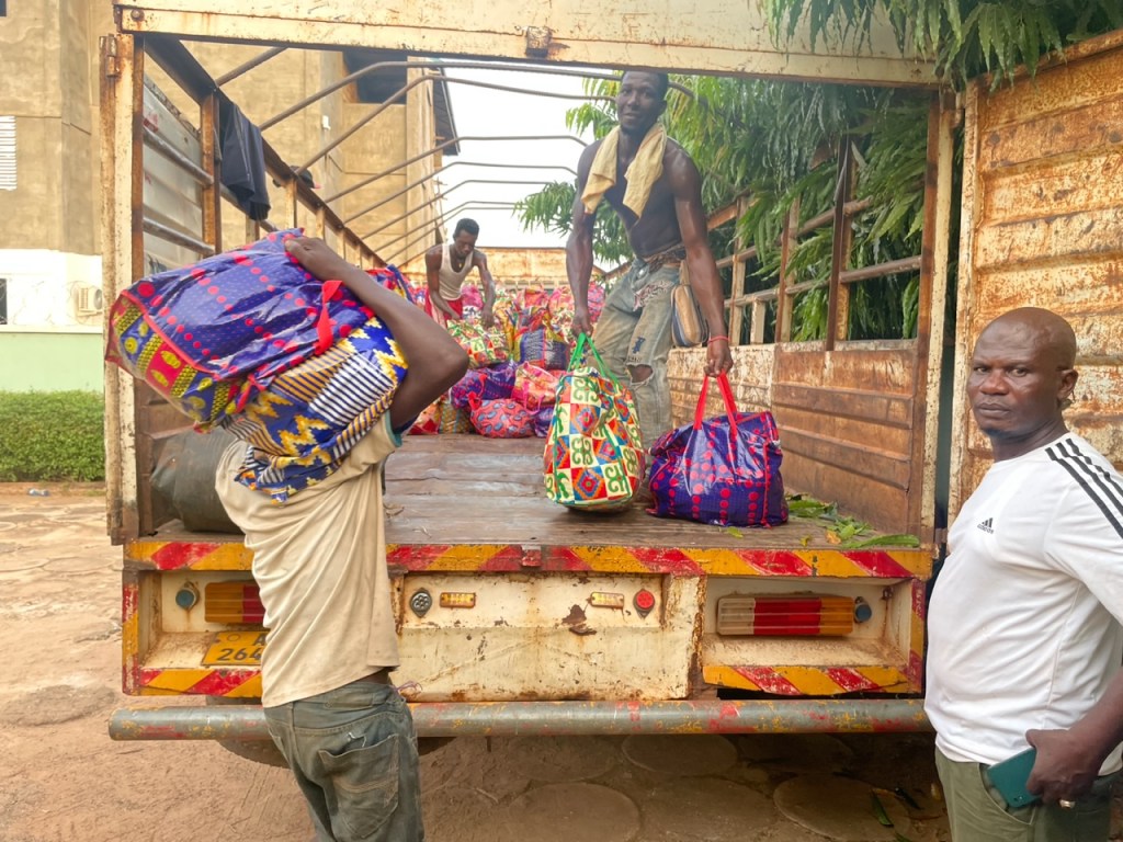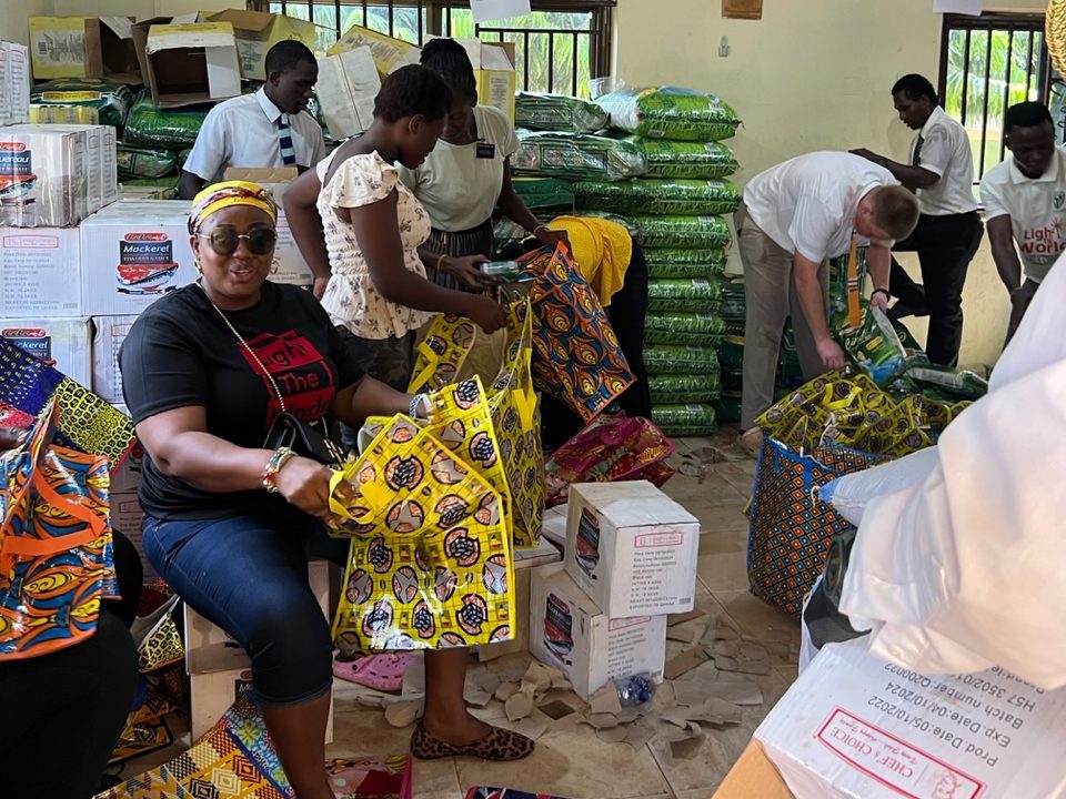 Now to the headline of this post, Light the World – Tamale! A couple of months ago we received a call that the Light the World kickoff this year would be in Tamale. It just so happened that the kickoff was on a day that we would be there for our zone conference so that worked out extremely well. Elder Nielsen and Elder Kyungu made the flight from Accra to the new Tamale International Airport on Wednesday and between their arrival and departure on Thursday late afternoon did a ton to build goodwill between the Church and the entire region. On Thursday morning, they drove to Yendi, a drive of about 75 minutes to the east of Tamale where the Dogban King lives. Dogban is the predominant tribe in the region and their language is Dogbani. Interestingly enough, most people speak English, yet much of the Light the World ceremony was in Dogbani. In any case, there was a flurry of activity for a few days in Tamale involving our senior couple Elder and Sister Ray, as well as the missionaries who serve in Tamale. Loading 800 bags with foodstuffs is quite the task. Handing it out was an additional effort that required coordination. The police were on hand to make sure everyone remained orderly, which they did. Sometimes when people hear there is free food, it can get out of the control quickly, but the people receiving the food were extremely grateful and the event was amazing. We even had some traditional dancers that did a very nice job of entertainment. Here are some pictures from the event.