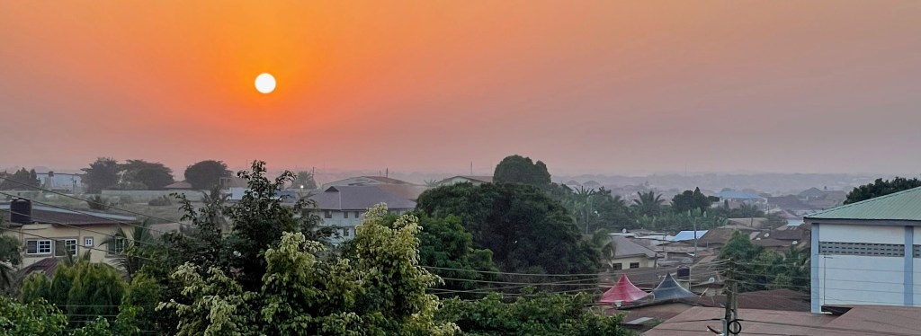 The title of this post does not match the picture, but they are related 😊. The picture is of the sun setting this past week. Harmattan has finally arrived in Ghana. It came a bit later this year because we had rain deeper into the month of December. The rain keeps the very fine dust blown in from the Sahara from collecting in the air. It is this very fine dust that provides beautiful red sunsets (albeit a bit muted).