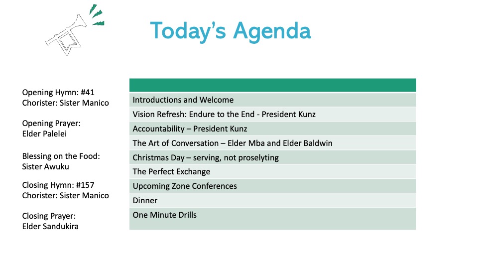 The centerpiece of the MLC was the presentation by the Assistants titled, “The Art of Conversation”. This was a masterful instruction on how to ask big questions and the use the gifts of silence and listening to be able to discern and hear the needs of people we are meeting and speaking with. I did a vision refresh on “Enduring to the End” and the ensuing discussion was wonderful. We also reviewed the numbers associated with the key indicators, talked about the Perfect Exchange, and discussed serving others on Christmas Day rather than proselyte. It was a great meeting.