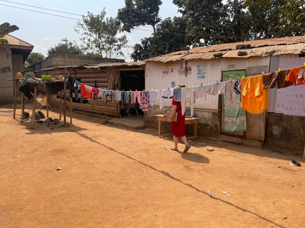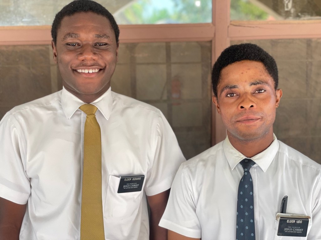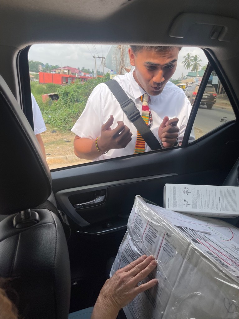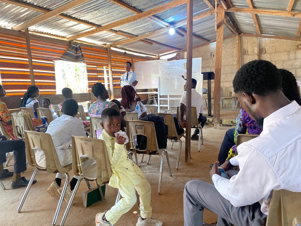 On Sunday, we ended up at Behenase, which is a relatively new branch in the University Stake. It started as a Group as part of the Aputuogya Ward and then became a stand-alone branch. It started because of a one man church where the “pastor” discovered the church and loved it so much, he became a member and then did what he could to bring his entire congregation. It was not a big Church and not everyone came, but there were enough with some additional move-ins from Accra that a branch was able to be formed. We began the day looking for the two missionaries who serve three units: Atonsu, Behensase, and Aputuogua. The zone leaders told us they would be in Atonsu so we attended sacrament meeting there. But no missionaries. We then drove to their apartment. No missionaries. I texted the Aputuogya bishop and he said they were not there. I tried calling numerous times…no answer. We were starting to get concerned. Then a few minutes later, after we prayed, they returned our call and told us they were in Behenase. I won’t go into the details about why they were there and not in Atonsu. They sent us a pin and we drove the 23 minutes to the branch from their apartment. It is generally about 45 minutes away from the mission home, but in a direction we don’t often travel. The roads have been under construction since we arrived, but now it is paved almost the entire way to where one turns off to go to the new Branch. The map above shows the route from the Mission Home to Behenase. Atonsu and Aputuogya Wards are within 20 minutes of Behenase. When we arrived we had to call the missionaries to come out and find us on the road because the place they meet is tucked into a neighborhood. It was a vintage village meeting house. Just enough comfort to hold meetings, but nothing more.