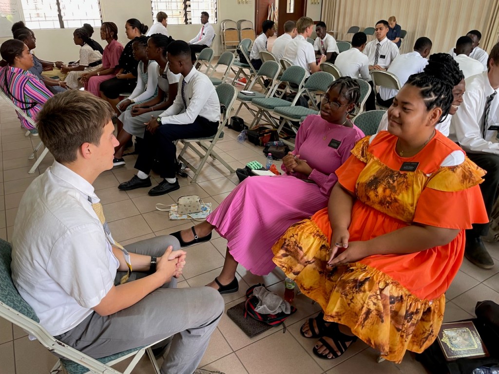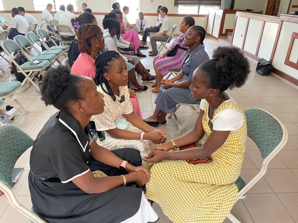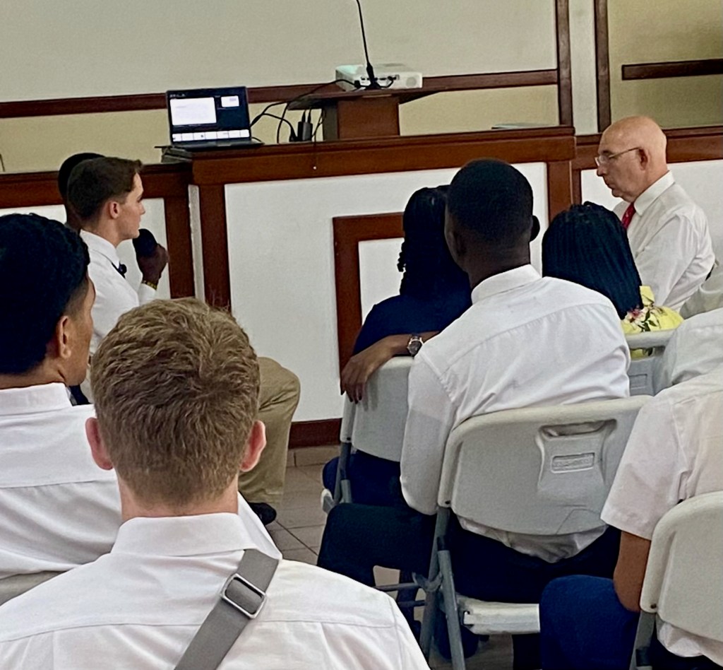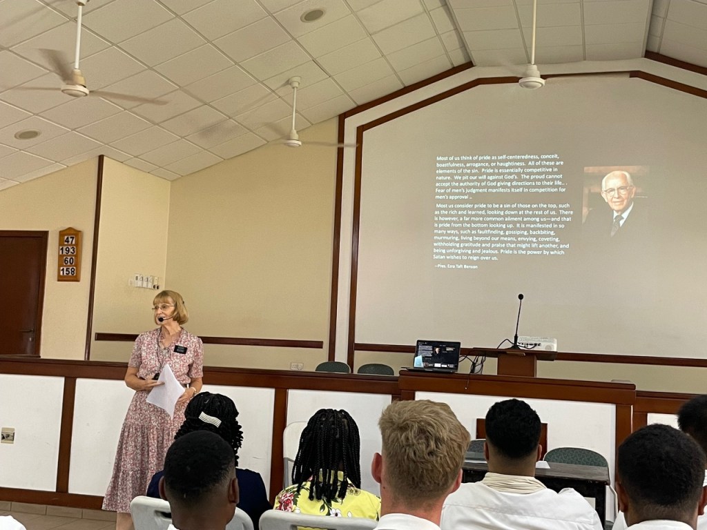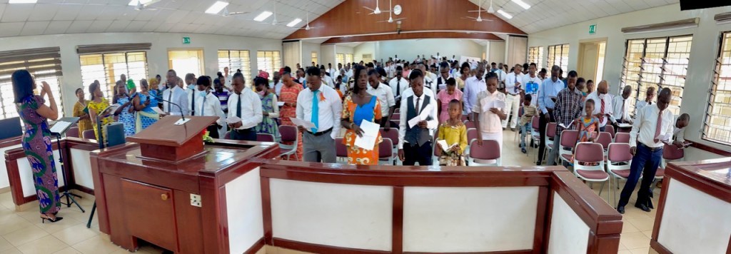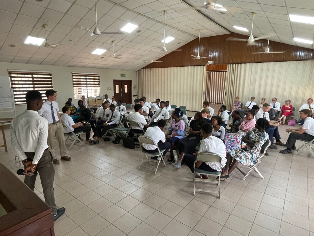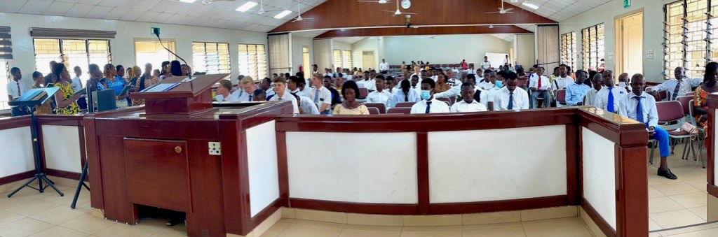 The Sunday general session had about 400 in attendance. After the opening hymn and prayer and sustaining of new Melchizedek Priesthood holders, I released the current presidency (Samuel Asare-Boahen, Benjamin Kittson-Mills (1C) and Ernest Sukar (2C). I then read the sustaining list of general and local authorities and leaders, stopping when I came to the section on the district presidency, and asked each of the members of the new presidency to stand. President Kennedy Frimpong Amoah, Ernest Atta Sukar (1C) and Ephraim Nana Yaw Awiah (2C). The sustaining vote was 100%. In the meeting we heard testimonies from President Kittson-Mills, President Sukar, President Awiah, and Mary Amoah (President Amoah’s wife). President Asare-Boahen then spoke on the Lord’s pattern (referencing D&C 52: 14-15) as it relates to the Area Vision. He was followed by President Amoah who focused on the importance of accepting calls to serve in the Lord’s kingdom. He encouraged us all to be active rather than passive members. The District Relief Society President (Sethlina Egyiri) spoke on covenants and the wearing of the temple garment (which was amazing). She was followed by President Edmund Obeng who spoke about God knowing our needs and saving us from our afflictions. LaDawn then bore a powerful testimony of the Book of Mormon and Jesus Christ. Because we were about 15 minutes behind schedule, she opted for a 3 minute testimony rather than a talk. I then took 7 minutes and spoke about the word “yearn” as it was the sense I had when the meeting started. The people came yearning to be fed spiritually. Interestingly that word only appears in the scriptures 3 times, and each time it is coupled with “bowels”. For example, in the story of Solomon deciding whose baby it was, declared it should be “cut in half” and each woman given 1/2 of the child. The actual mother is recorded as “her bowels yearned upon her son”. This great desire to blessings can be ours if we will study the scriptures every day and grow our faith in Christ and then exercise that faith through discovering the joy of daily repentance. Elder Pambu had the last 30 minutes and focused on exact obedience to the commandments of God. He encouraged the congregation to share the gospel more often in natural ways and to follow the Come Follow Me program. He reinforced the simplicity of the Book of Mormon and the Doctrine of Christ and knowing our duties by studying the handbook of instructions.