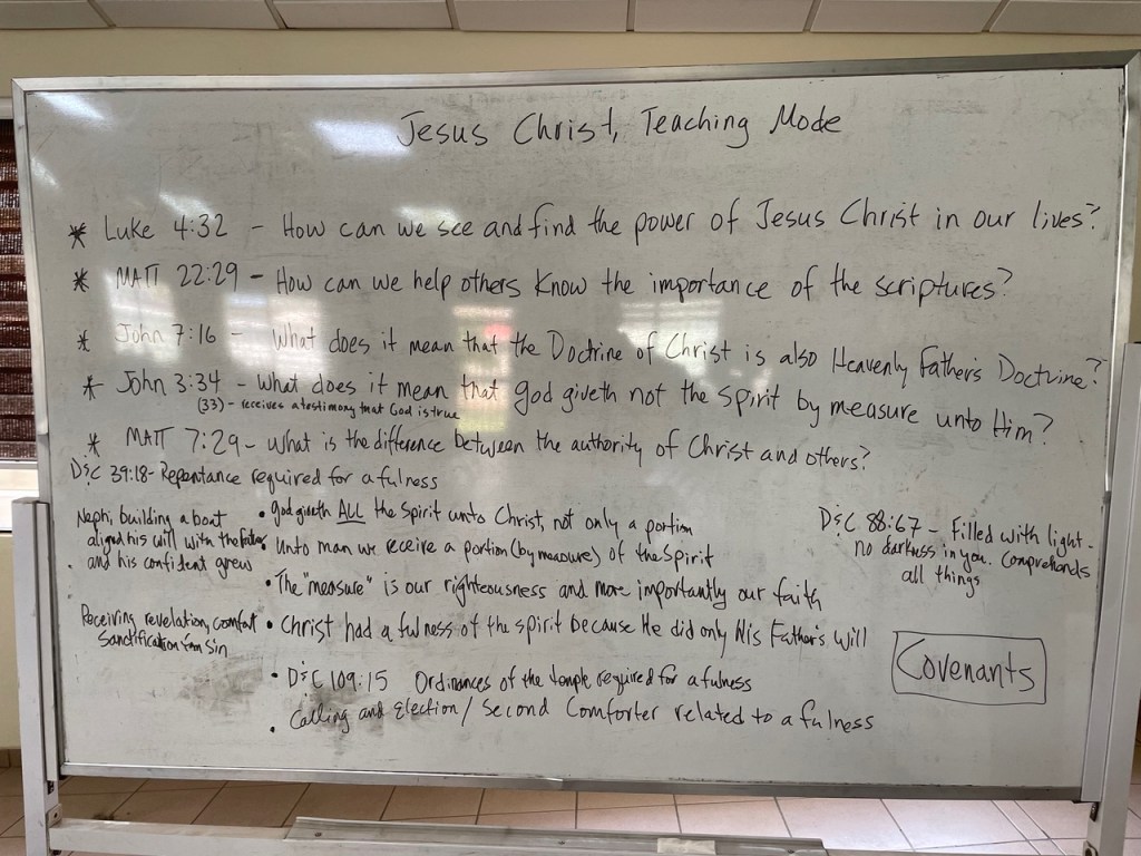 - Since we do not hold district council the weeks of zone conference, we carved out some time to discuss the “Jesus Christ scriptures” that we are studying as part of the 26 week study and improvement plan. Elder Baldwin led the discussion on the topic of “Jesus Christ, teaching mode”. I was the scribe on the whiteboard.