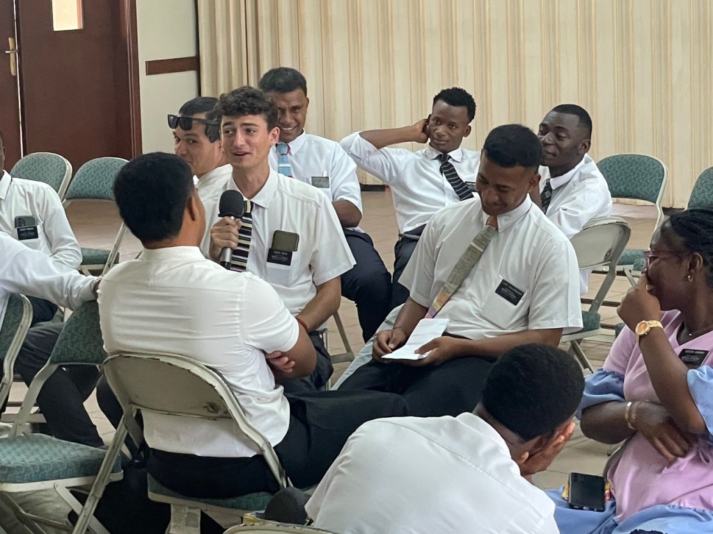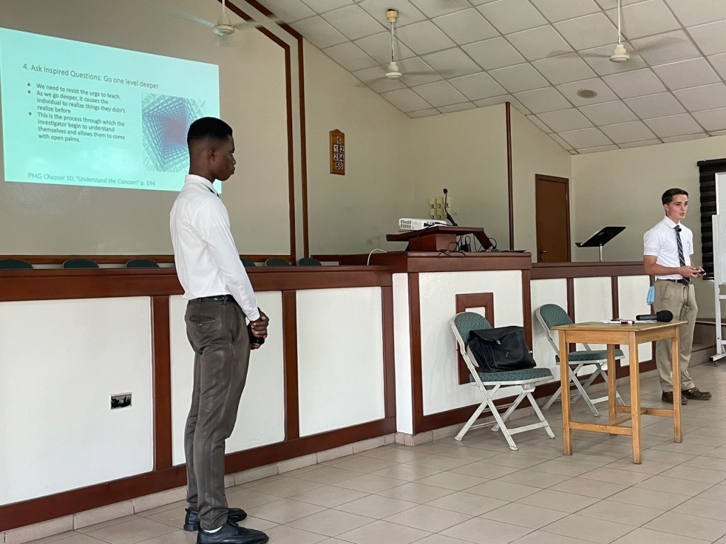 - The Assistants instruction was titled “Led by the Spirit“. It was good at the MLC meeting, it was even better at our zone conferences this past week. As part of this instruction, we did a role play. The Assistants were the missionaries and I was Kwame David, someone they had just met. In the first example, they try to trap me into acknowledging that my “baptism” was wrong because it was not done like Jesus Christ’s baptism. Though it was a role play, I felt the frustration that people must feel when we do this. In the second example, they slowed down and listened to the spirit. They spoke less and allowed the spirit to teach Kwame during the silence. Although they saw plenty of opportunities to jump in and teach Kwame a principle, they held back and allowed the spirit to create in me a longing for what they knew. It was so real to me and the difference in the two examples was night and day. I don’t know if missionaries can learn to do this, but if they can, it will change the entire mission yet again. We did the same unscripted role play at each conference last week with the same result. From the ensuing discussion, the missionaries saw something new that they needed to start working on. We then gave them about 20 minutes to practice new skill of slowing down, listening to the spirit, and teaching accordingly. The missionaries were arranged so that each companionship taught one person (usually one of the newer missionaries). The spirit in the room during this role play by the missionaries was amazing. As part of their instruction, they shared a video about being led by the spirit. It is very short, but very powerful.