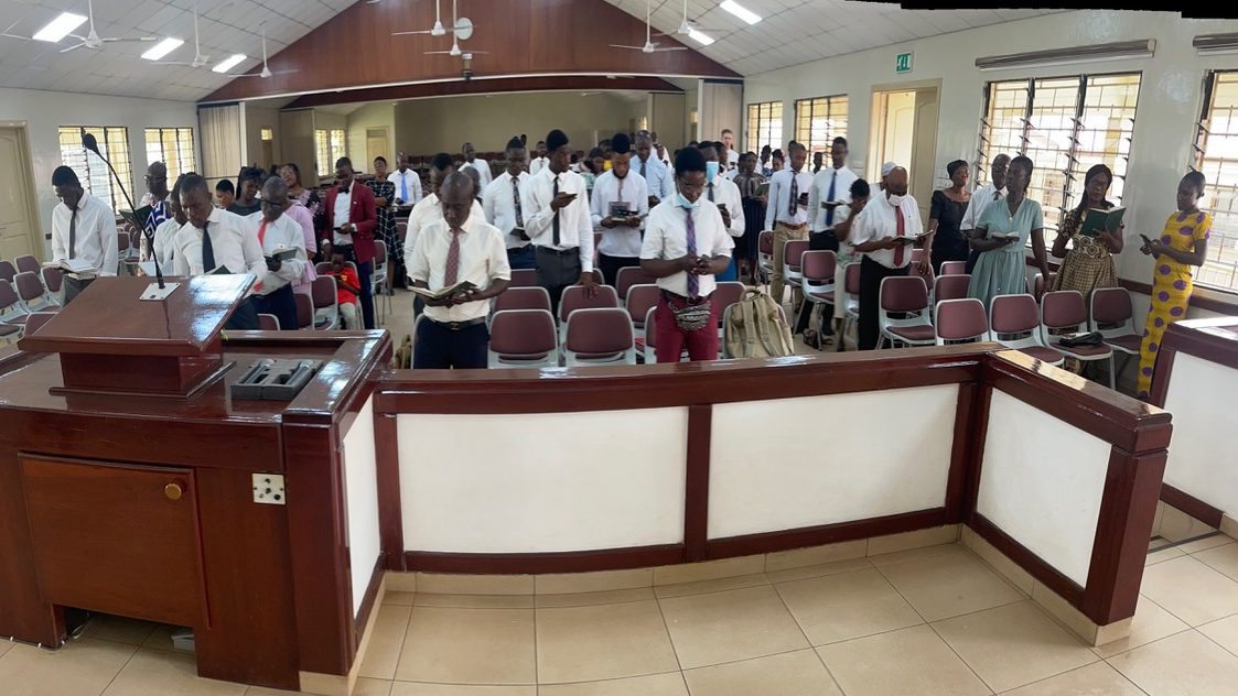 The adult meeting started at 12:30 pm. Elder Pambu had a zoom meeting with all of the Area Seventies and Elder Bednar and Elder Kearon. He thought the meeting started at 1:00 pm, but it actually started at noon, so he went to his meeting in the District Council room and we went ahead with the adult session. We had 130 members in attendance. President Sukar spoke first on the topic of the importance of the sacrament. He gave a masterful talk (he always does). One of the scriptures he quoted was 3 Nephi 20:8 “And he said unto them: He that eateth this bread eateth of my body to his soul; and he that drinketh of this wine drinketh of my blood to his soul; and his soul shall never hunger nor thirst, but shall be filled.” He testified that the promised blessing is “sure”. Albert Damtse, the branch president from Duayaw Nkwanta then spoke on gathering Israel through family history. Another great talk. Mercy Touffor, a young single adult and returned missionary spoke about the value of the Book of Mormon in strengthening our testimonies and how the Come Follow Me program this year can really benefit the members in becoming more like Jesus Christ. President Obeng spoke next. Seeing that Elder Pambu had a big portion of the meeting, he tried to help out by speaking for 20 minutes on the atonement of Jesus Christ. One of his quotes I really love that he shared is this: “When our eyes are not focused on the Svior, there are things we simply do not see”. He also emphasized the hope that is available to us through the atoning power of Jesus Christ. It was a beautiful talk. LaDawn was next and just as she was beginning, Elder Pambu walked back in. She sat down and he came to the pulpit and spoke for about 10 minutes. He had a flight out of Sunyani back to Accra at 3:00 pm and so after he spoke, President Obeng walked out with him. Before he left, I asked him if we should just end the meeting now since he was the presiding officer and he said “that’s fine”. So we sang the closing hymn, a prayer was offered and the meeting was adjourned. It was a great weekend with the saints in Sunyani.