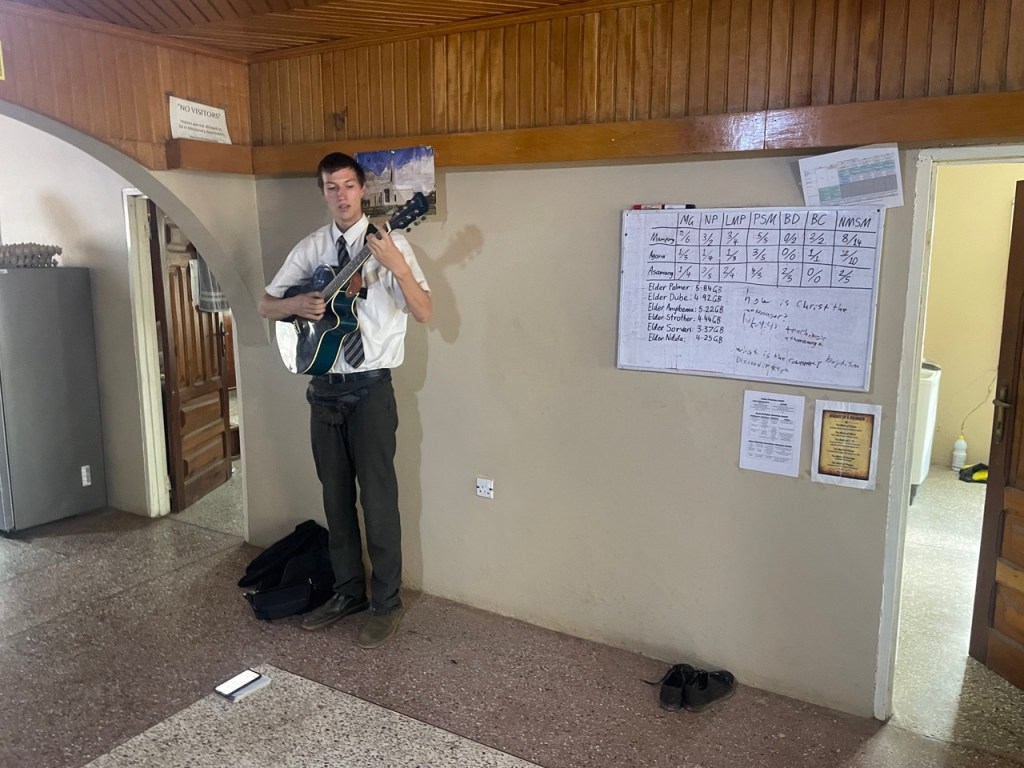 On Tuesday, Feb 27th, we traveled to Asamang and participated in the district council where Elder Strother is the District Leader. At the end of the meeting, Elder Strother played guitar accompaniment for our closing hymn. The meeting was good followed by four interviews (I had done two before the meeting). We then traveled to Effiduase and interviewed the four missionaries living there and then stopped in Kwamo and interviewed Elder Frazier since he had recently been transferred and would miss the interviews later in the week out in Nkawkaw.