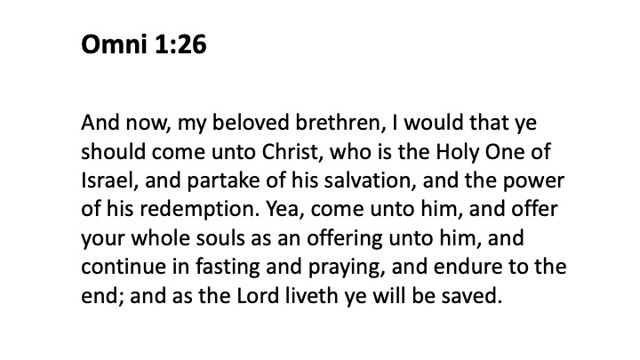 Following the discussion about the glory of Jesus Christ, we did a vision refresh, but this time it was focused solely on the Savior. It was a great transition as we first heard about the impact studying these topical guide scriptures on Christ are having on the missionaries. I wish we would have started studying these scriptures much sooner, because we can see their faith growing and their desire to know more about their Savior. These scriptures are a game changer. We then moved to discuss what it means to Come Unto Christ. We only used two scriptures: Omni 1:26 and D&C 88:63. Here are the key slides we shared.