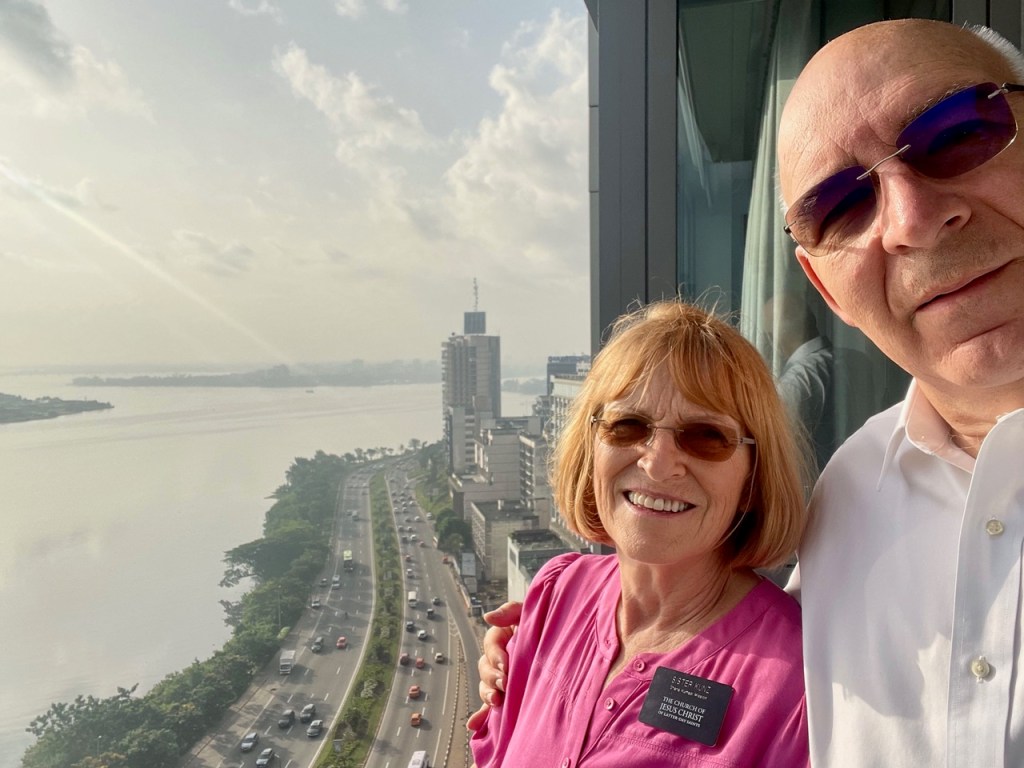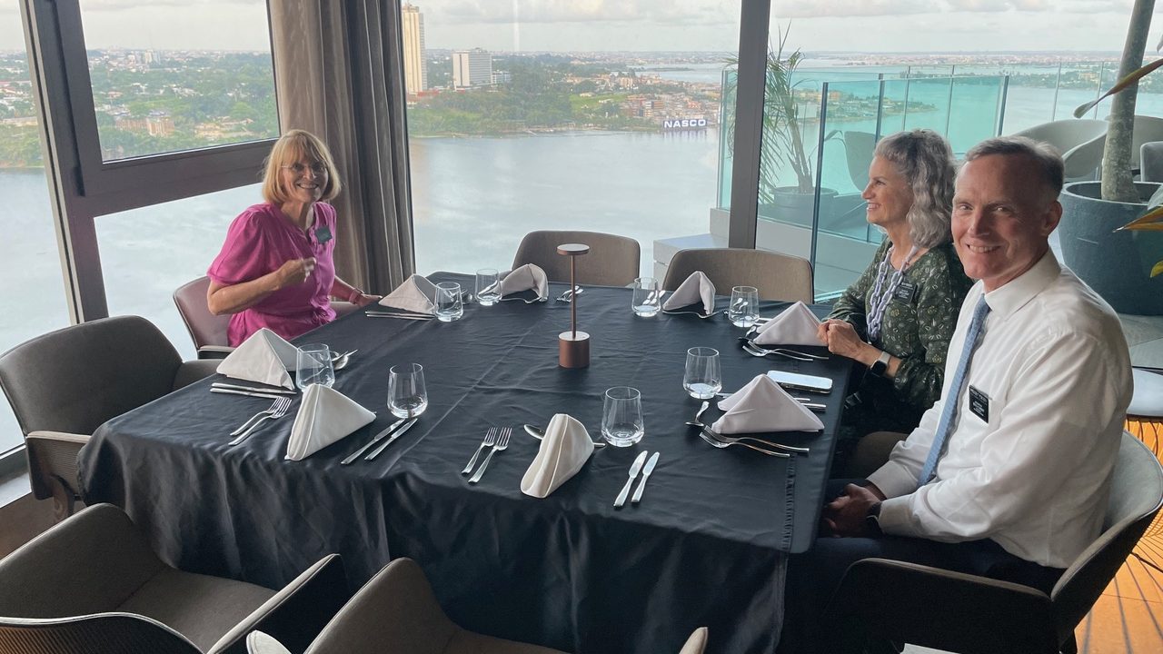 The seminar started Wednesday night with a dinner on the 21st floor. Again the scenery was beautiful as we had big picture windows to enjoy the water below. Here is a picture of that dining room taken later in the week with President and Sister Robinson who preside over the Abidjan North Mission.
