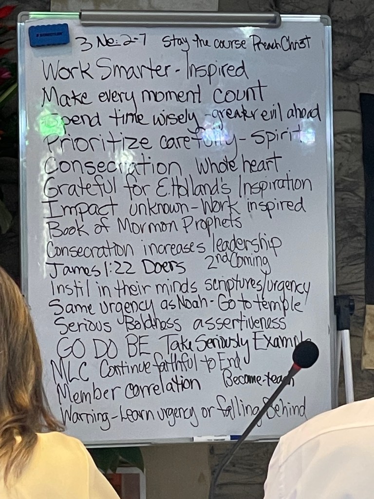 - Elder & Sister Nielsen: The Urgency of your mission. Talked a lot about Elder Holland’s experience and the message given him to “go back and upgrade your urgency”. Scriptures on Urgency – Helaman 13:38 (“your days of probation are past”). Alma 34:31-40 (“this life is the time for man to prepare to meet God”). Mosiah 2:41 (“consider on the blessed and happy state of those that keep the commandments of God”). NOTE: this may have been my favorite session. The question for me is what does he mean by “urgency”? Sister Nielsen took some notes on a white board as we discussed this question broadly as mission leaders. For me, I landed on a greater sense of urgency around sanctification and consecration. It was interesting how it had different meanings for many of us.