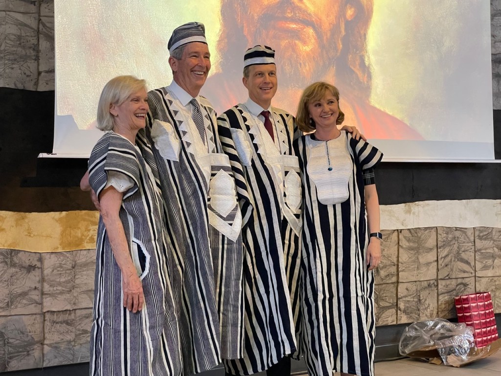 On Friday evening with the Area Seventy present, Elder and Sister Klebingat and Elder and Sister Nielsen shared their testimonies. Afterwards, they were presented with traditional “chief” clothing. Elder Nielsen will turn 70 this year and become emeritus. Elder Klebingat is going back to Church HQ to serve on 3 different Church committees, including the missionary committee. How we have come to love these selfless and devoted servants!