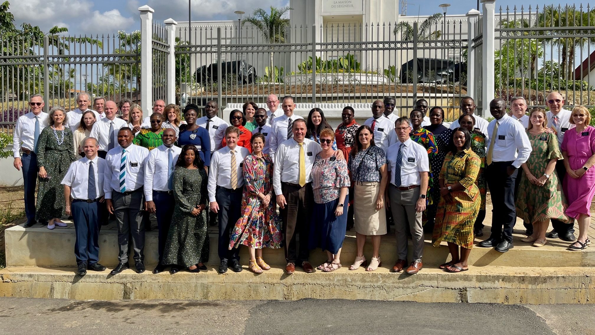 On Thursday afternoon, we were all able to travel in vans over to the Abidjan Temple. It has been in the planning and construction phase for 7 years. The construction standards have been difficult to achieve and the Church will not put it into service until it meets the high standards of temple construction. It is a beautiful structure. All of the mission leaders were able to join together in a picture in front of the temple.
