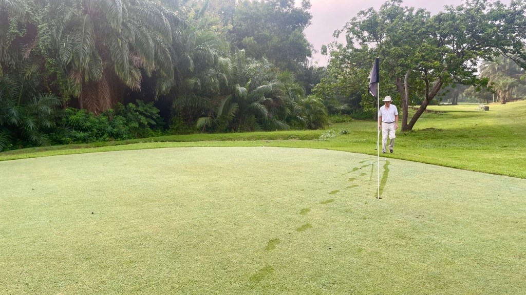 Back to Monday, when Elder Pack and I went golfing for the last time. A storm had come through the night before bringing strong winds and rain and leaving a lot of leaves and debris from the surrounding trees on the course. It was also very humid as you can see from the dew in the picture below. Still a great chance to be out in nature with Elder Pack enjoying some healthy exercise.