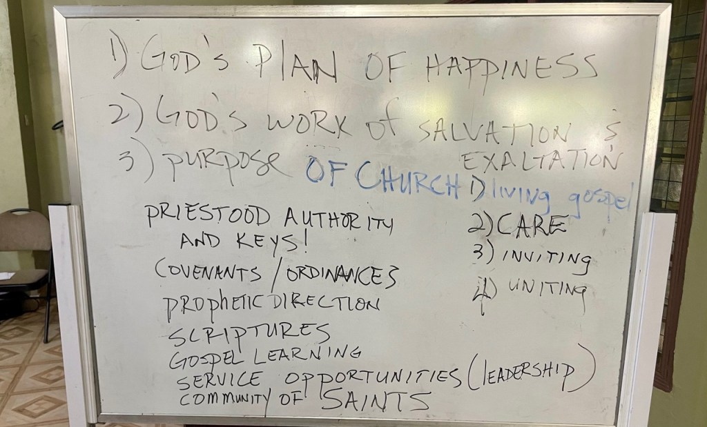 On Saturday morning, Joseph Asante and I met with the Bibiani District Presidency at 8:45 am before the leadership session which started at 10:00 am. President Arthur, the first counselor, was in a very serious accident last year and is still mending in Accra from a severely broken leg. We hope he will be back in the District soon. While the sisters are not invited to the leadership meeting unless an Area Seventy presides, the word did not get out to them and the branch and district organizational leaders came to the meeting. Some traveling over 90 minutes to get there. Rather than tell them they could not join, we took advantage of their presence and in my remarks talked about the Purpose of the Church and the Work of Salvation. Elder Kirk was my whiteboard scribe and did a great job!