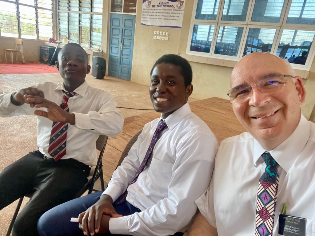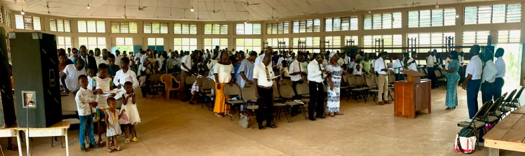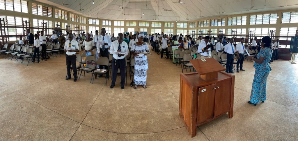 On Sunday, we met in the Bibiani Senior High School auditorium at 10:00 am where we had 430 people attend the general session. That was a record and represented over half of the members of the district. Sunday General Session topics included: Importance of honoring our covenants and trusting in the Lord to help us through life’s challenges as covenant keepers; How to remember Jesus Christ throughout the day (primary child); How personal prayers strengthen us (Young Woman); How the Book of Mormon strengthens us (YSA preparing for mission); Sowing the seeds of faith in our children; Standing as a witness of Jesus Christ; Urgency in the work through improved leadership as leaders grow their faith in Jesus Christ through daily study of the Book of Mormon, payment of a full tithe, and daily repentance.