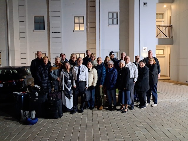In the last post, I mentioned the 43 senior missionaries that we have serving in the Area Office. With 21 couples and one sister, there is a constant turnover. This past week, Elder and Sister Sherwood, who served as FamlySearch specialists, went home and within days, the Lewis’s arrived (Family History Specialists). The tradition is for the couples to gather as others come and go for a sendoff or a welcome. Here is the picture from the Lewis’s arrival. We did not attend the departure for the Sherwood’s as we never really knew them. It makes light work when there are a bunch of people to carry luggage up the stairs to the apartment! And yes, it was chilly!