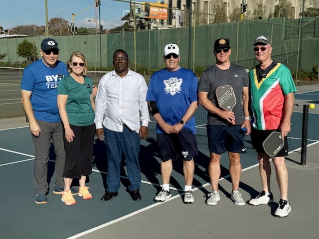 It was shortly after the conclusion of the devotional that we received a call from Elder Kerry Johnson (Area Medical Advisor). Elder Rasband had been in Johannesburg since the prior Thursday. He held leadership meetings and devotionals and dedicated the recently completely BYU Pathway General Education Center. He hadn’t been feeling well during most of his visit, and while they had planned a day away outside of the city in one of the wild animal parks, Elder Rasband decided it would be better if he stayed back and rested a bit. However, later that afternoon he really wanted to get out and get some exerice. He likes to play pickleball, so Elder Johnson arranged it and we were invited. So at 2:30 pm we showed up at the Pickleball courts and enjoyed about an hour of playing against him. He is quite good. Very strategic in his ball placement. We were grateful for the opportunity to rub shoulders with an Apostle of Jesus Christ – even if on a pickleball court!
