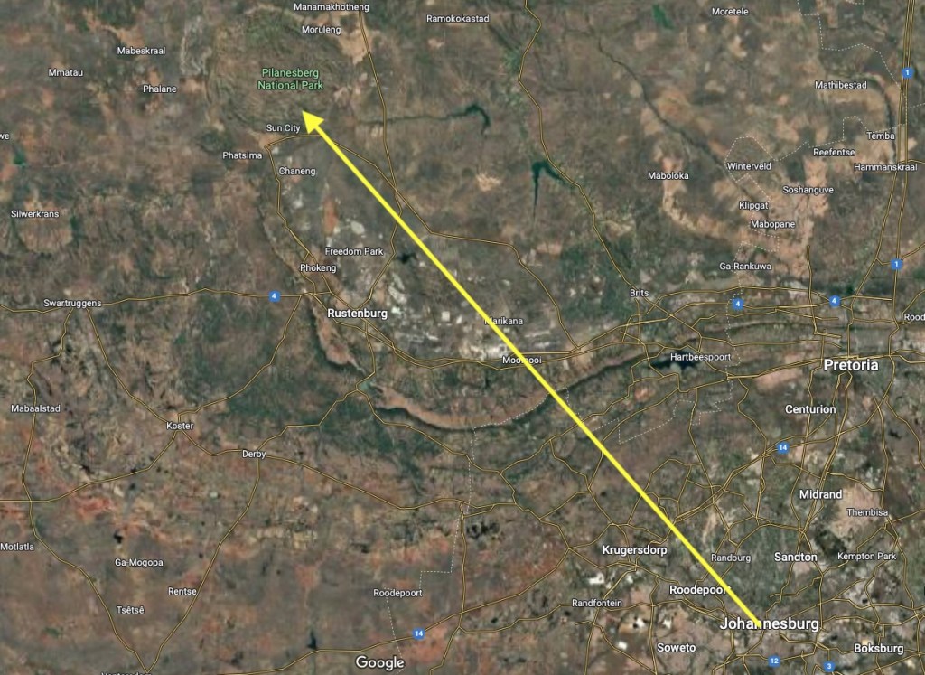Pilanesberg is a three hour drive from Johannesburg. In the map with the arrow you can see the relative distance. I assure you the road was not so straight. We left at 5:00 am and arrived just after 8 am (we stopped for gas before leaving). Elder Johnson was kind enough to drive as he makes the trip often. Between 8 am and noon we saw a good collection of animals. Between noon and 3 pm, not so much. But as if an alarm went off and the animals awoke, around 3:00 pm, the animals again appeared. Below is a gallery of some of the best pictures we took for the day.